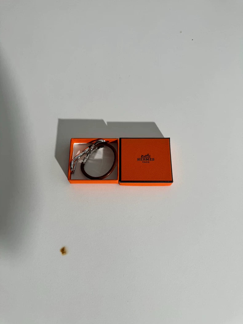 Hermes Double Silver Buckle Leather Bracelet