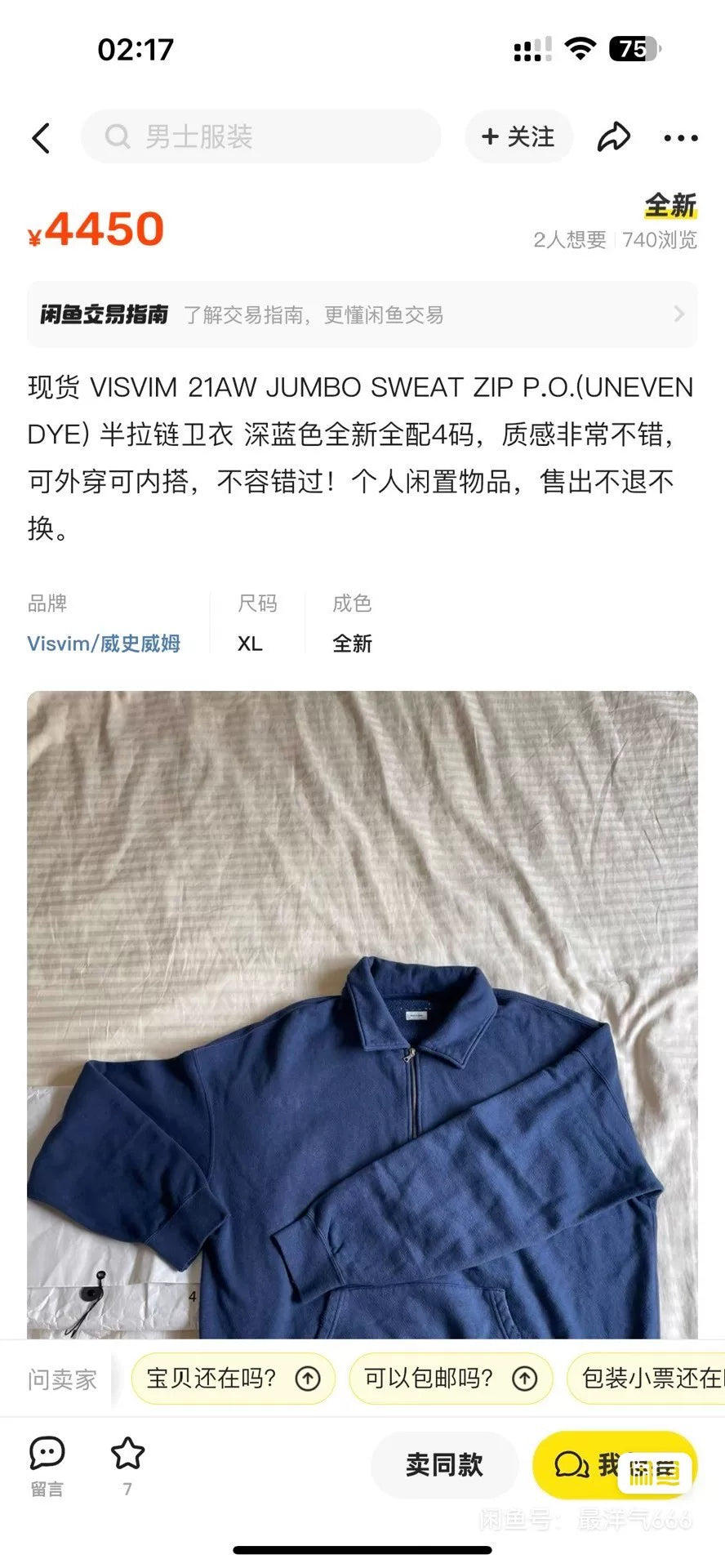 visvim jumbo zip pullover sweatshirt