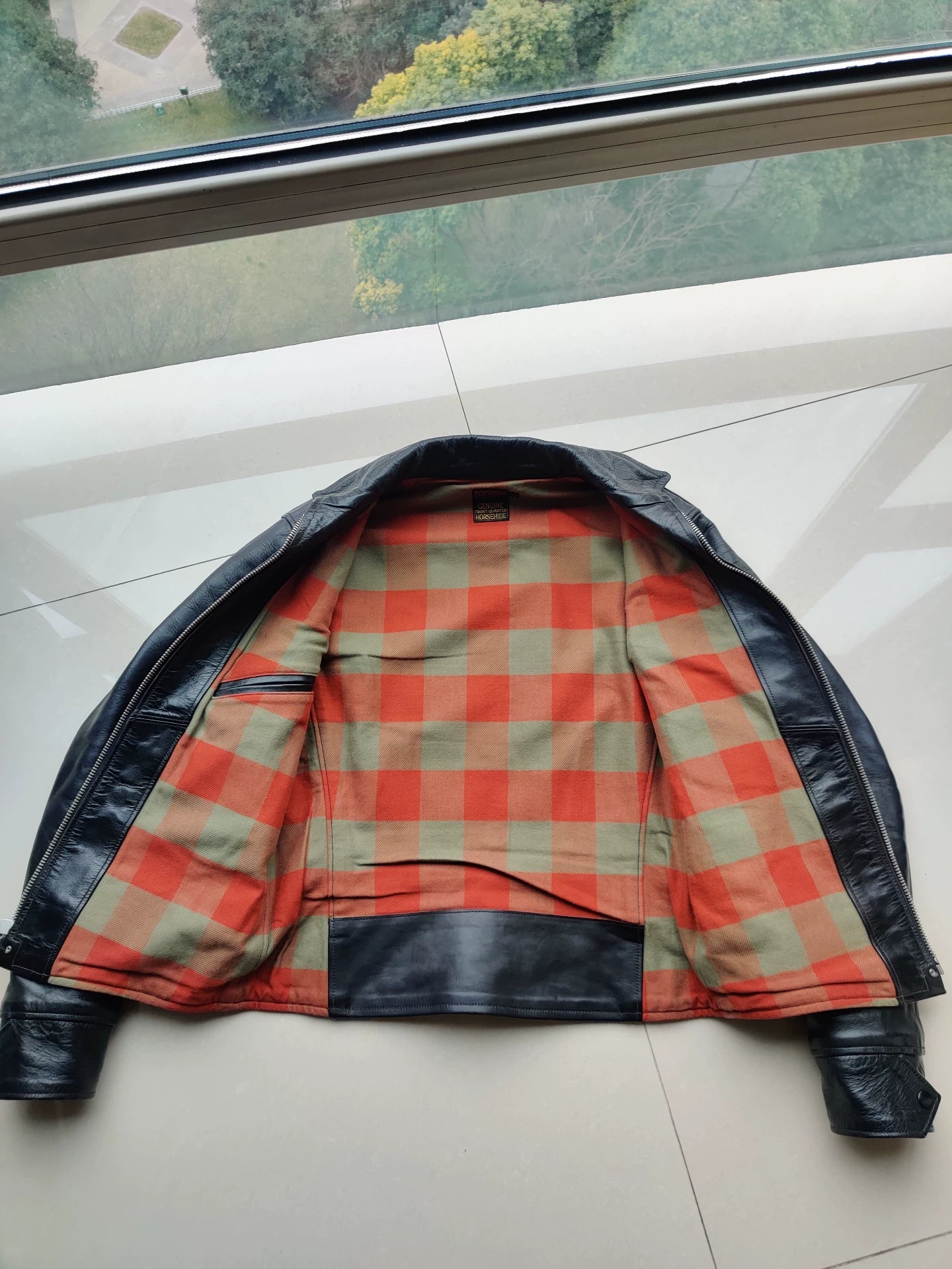 black leather jacket with snowflake pattern