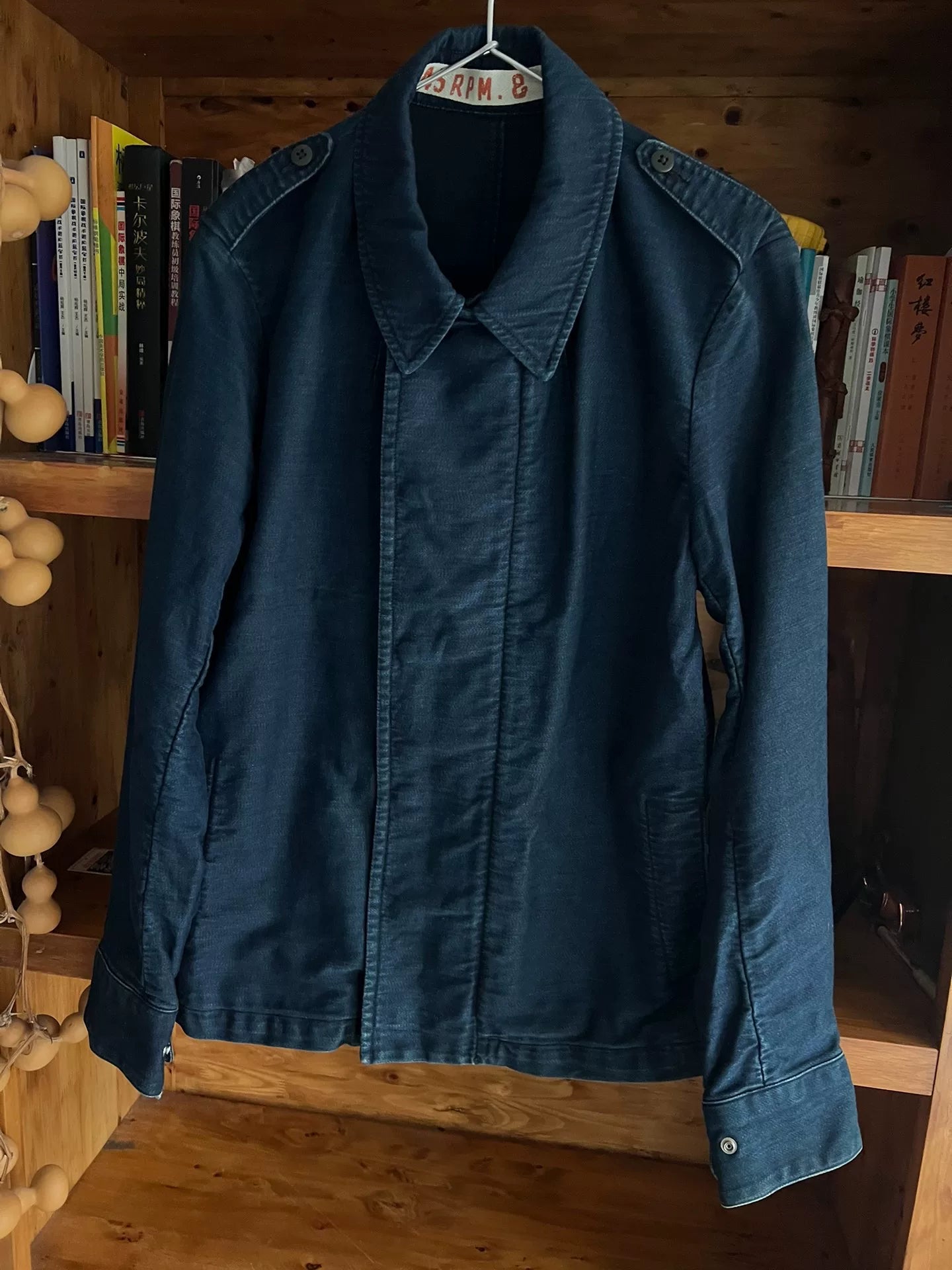 blue dyed motorcycle jacket with subtle vintage touch