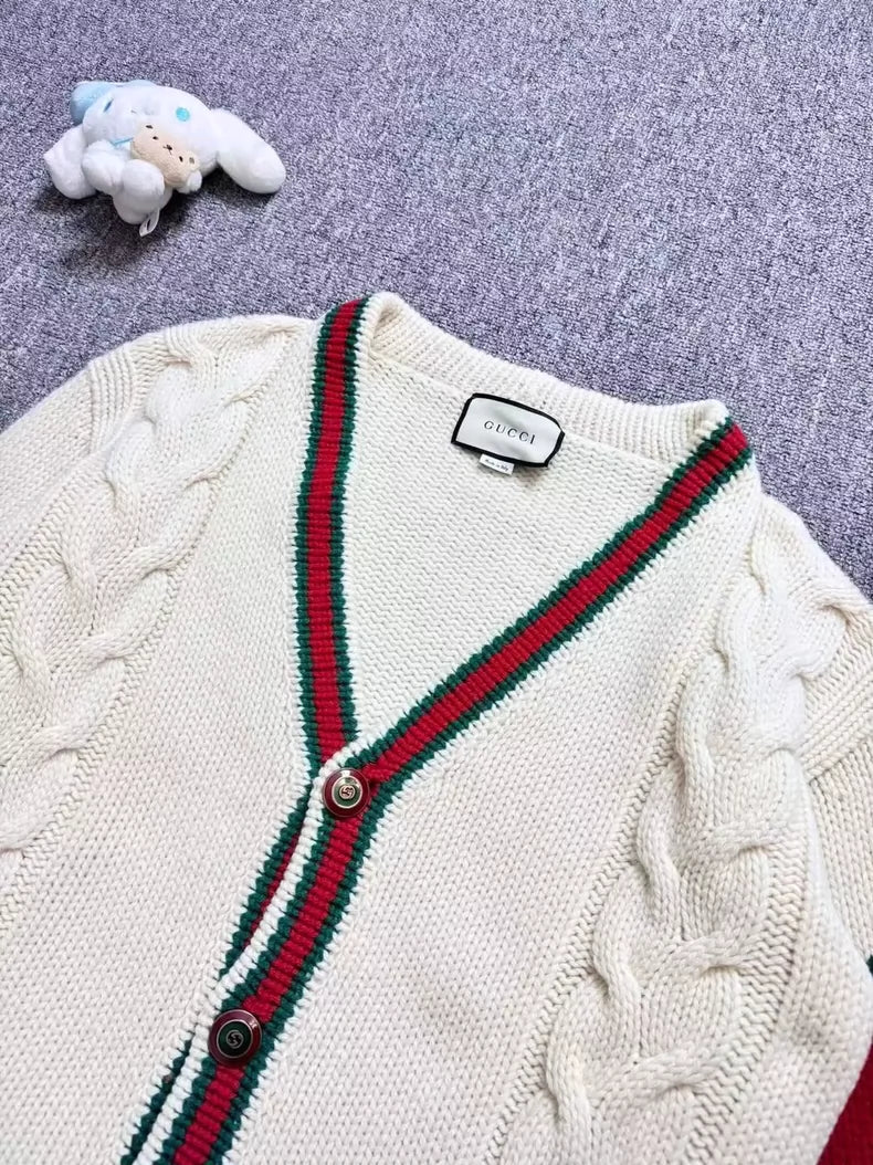 Gucci White Knit Cardigan with Red Green Stripes