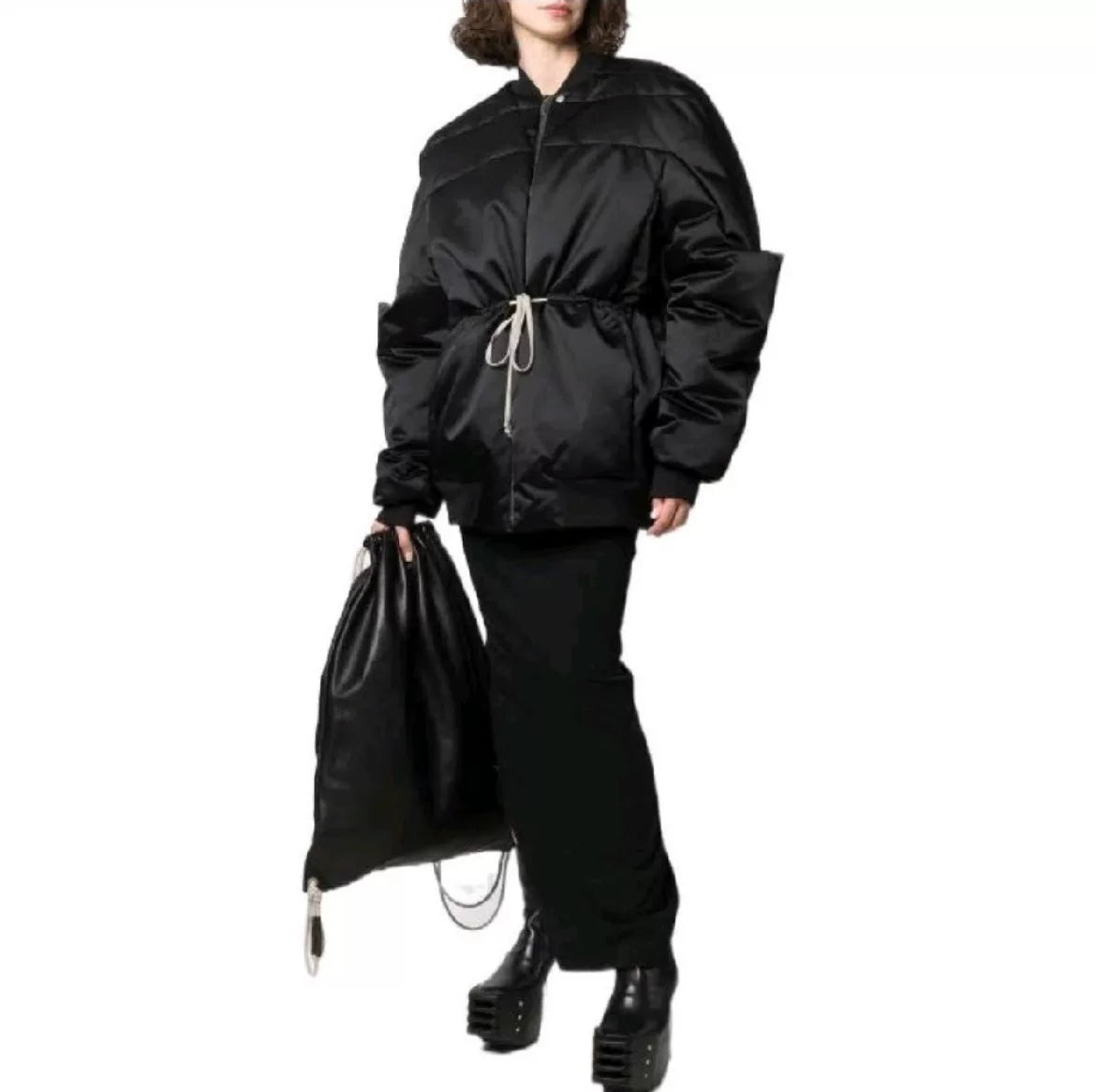 oversized black puffer jacket with waist tie