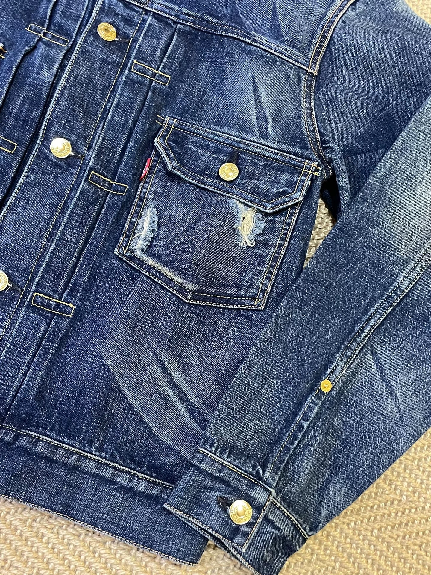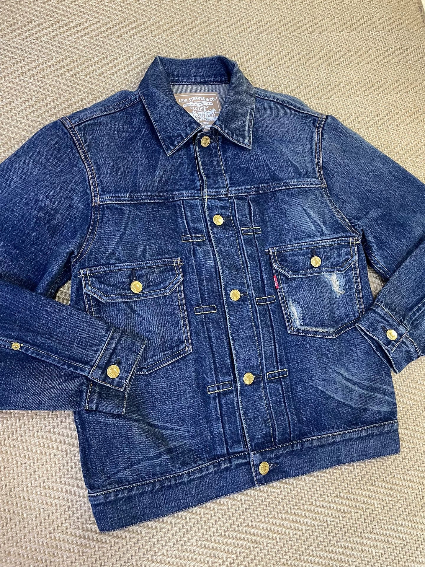 stylish blue denim jacket with gold buttons