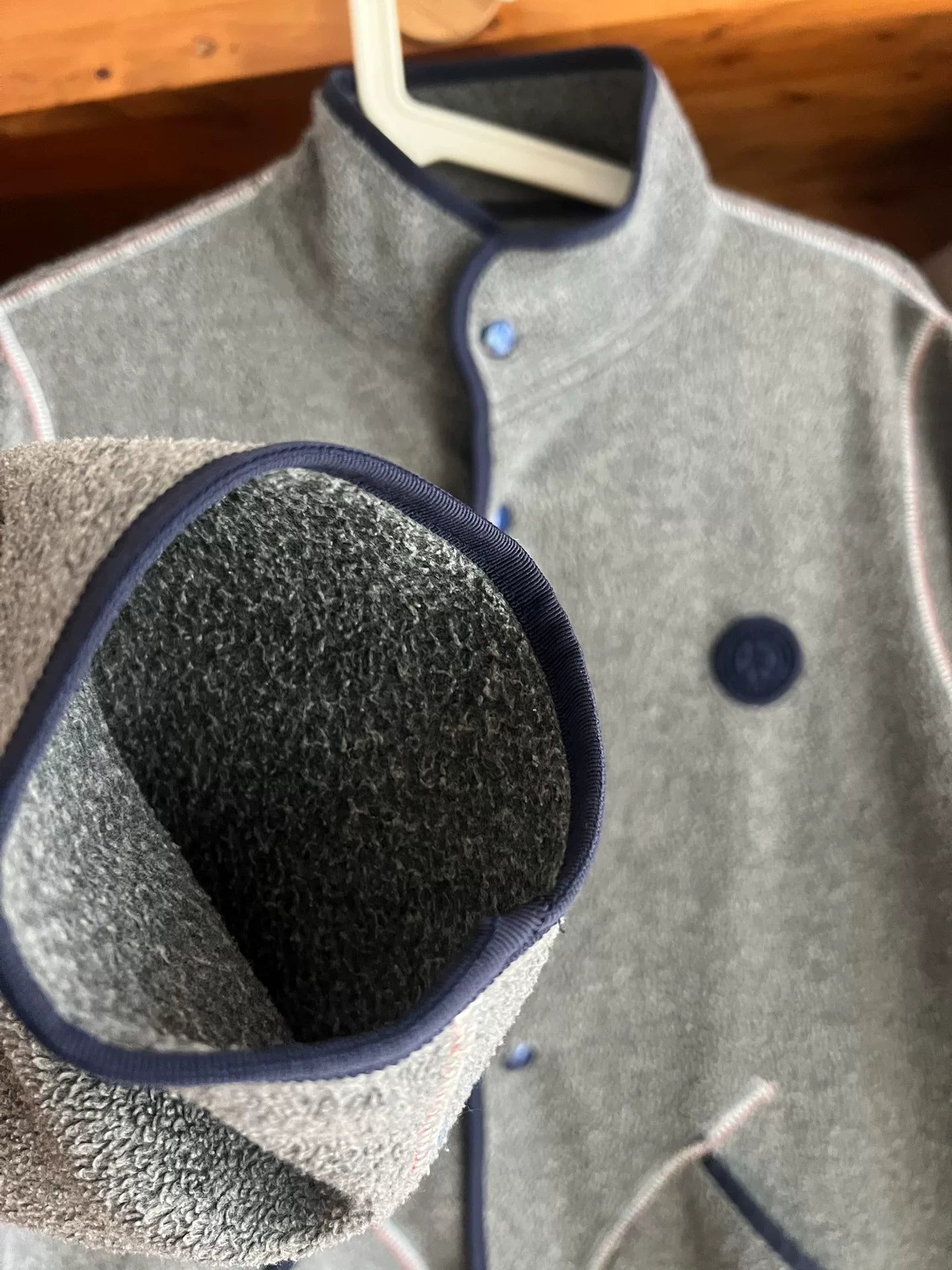 stylish gray fleece jacket with blue accents